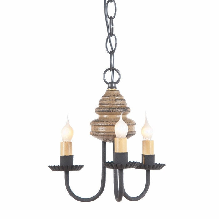 Three (3) textured black metal arms stem from the spun wood center each with melting candle fixtures mounted on a crimped tin pan.