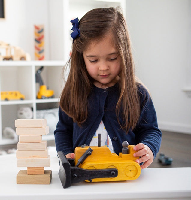 This is an excellent, working wooden bulldozer. A beautiful toy or display on its own or accompanying the large flat bet truck (offered as a set)! A great way to gather building blocks (sold separately).