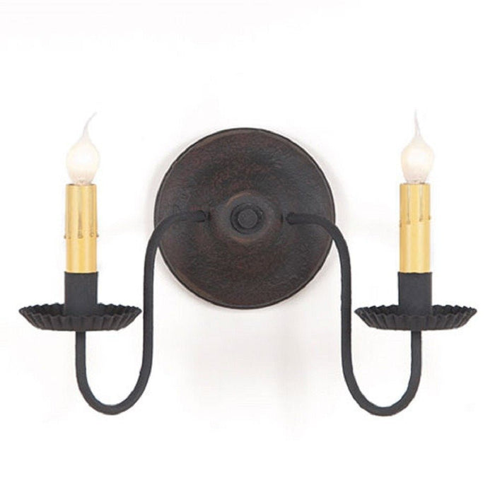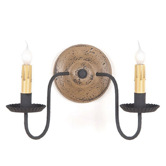 Hand-crafted and made in the USA, these lights feature dual black-textured arms with crimped pans and 2 candelabra sockets (60w each)!  The round wood mount is finished in your choice of four distressed, rustic finishes - further enhancing its warm, welcoming glow.  From entryway to foyer - from hallway to family room - you will love the ambiance this light brings to your decor.