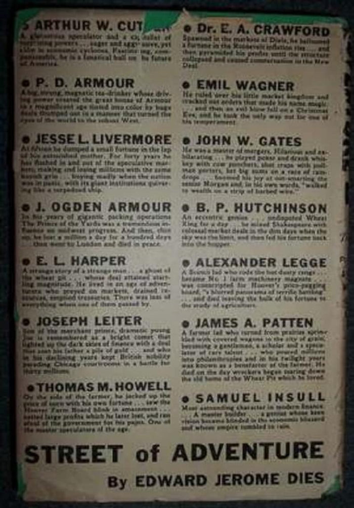 This work stands among the earliest narrative explorations of American stock market culture, offering dramatic portraits of legendary figures such as Armour, Insull, Legge, Livermore, and others. It is widely regarded as a foundational text for understanding the human forces that drove early twentieth-century markets. Five years after publishing Street of Adventure, Edward Jerome Dies was selected to write the preface for Jesse Livermore’s How to Trade in Stocks, further cementing his credibility and influence. He later authored Behind the Wall Street Curtain, The Plunger, and The Tale of the Wheat Pit, all respected works within the canon of classic financial writing.